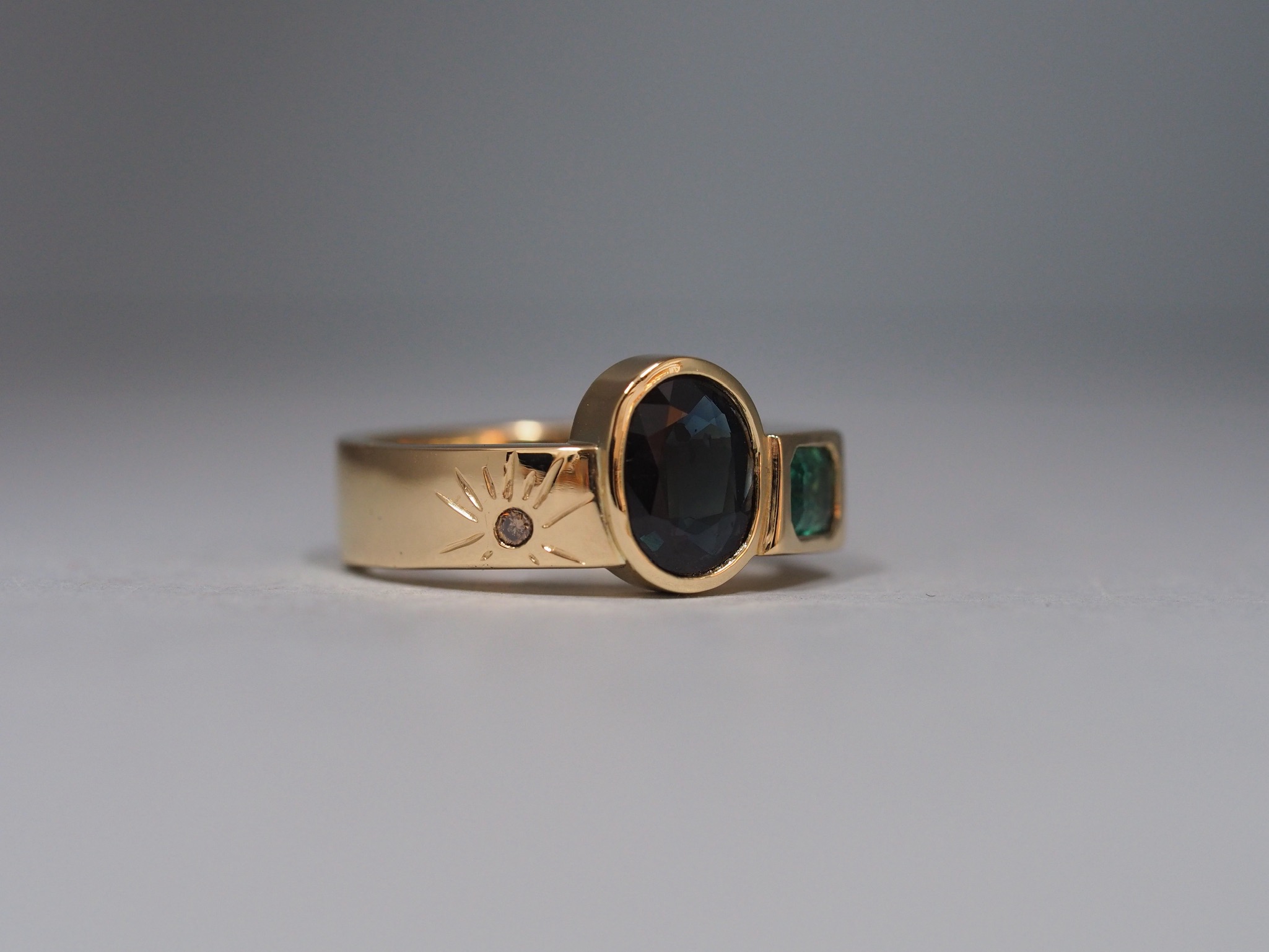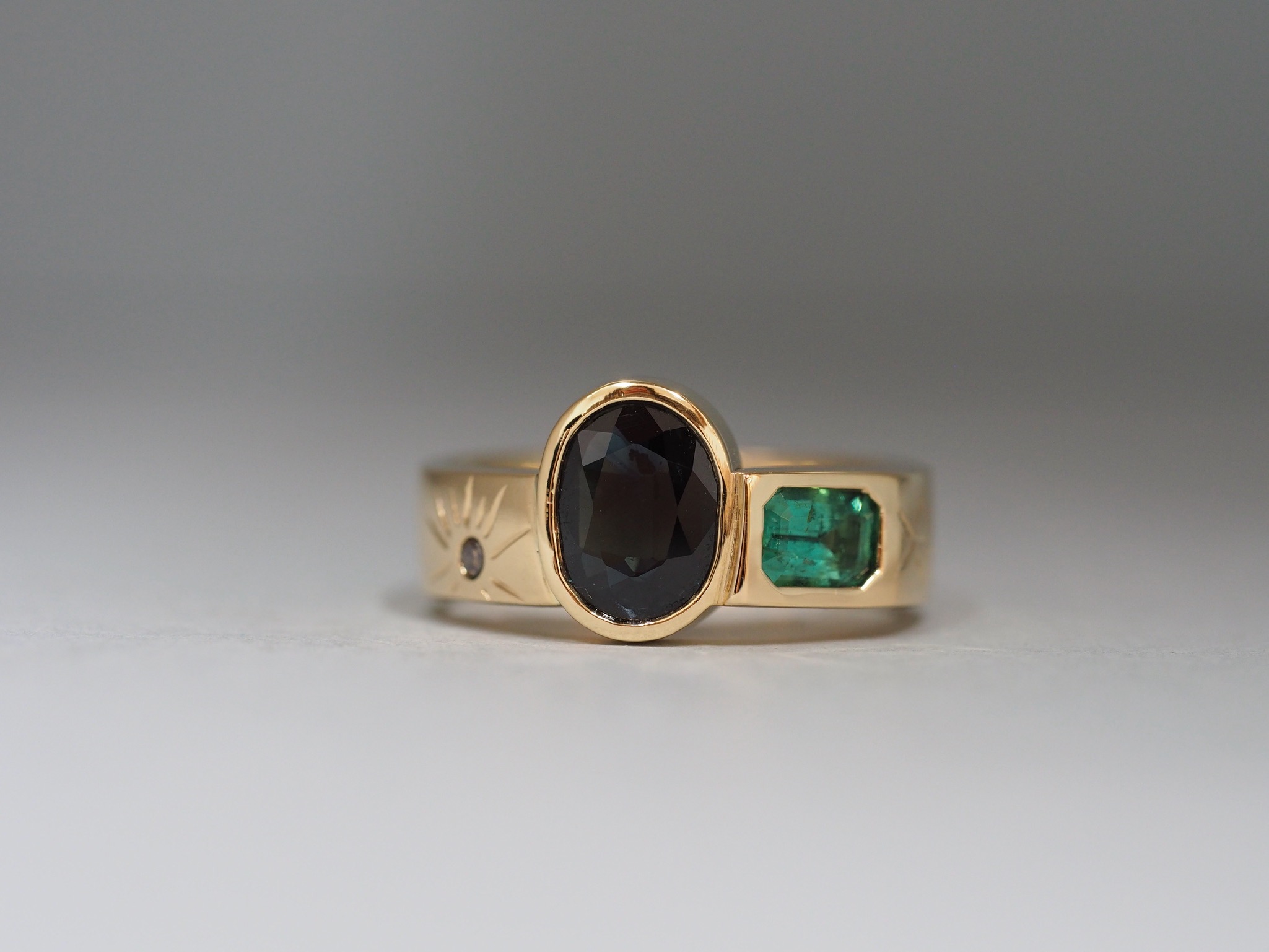 Set into a solid gold band, the smallest stone was flush set with hand-engraved lines to represent the sun. The large, dreamy sapphire was offset to represent the moon and the emerald was bezel set with triangle engravings to signify a shooting star.